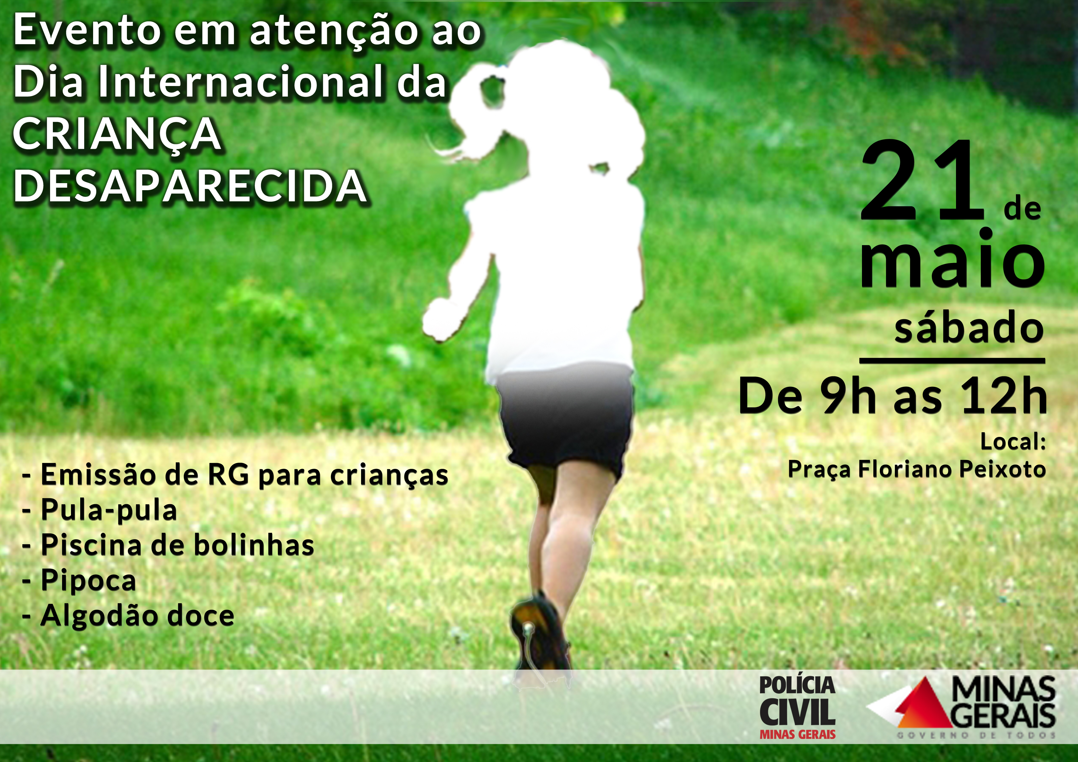 Para conscientizar e orientar a população sobre os desaparecidos em Minas Gerais, a Polícia Civil promove no próximo sábado (21) um evento para marcar o Dia Internacional da Criança Desaparecida (25 de maio) na praça Floriano Peixoto de 9h às 12h. Na ocasião, a corporação irá fornecer dicas aos pais para evitar o possível desaparecimento de seus filhos, atrações para as crianças como pula-pula e piscina de bolinhas e também orientações sobre o que fazer em caso de desaparecimento. Além disso, poderão ser retiradas, no dia, a primeira via da carteira de identidade das crianças, um procedimento importante para evitar o desaparecimento de menores.