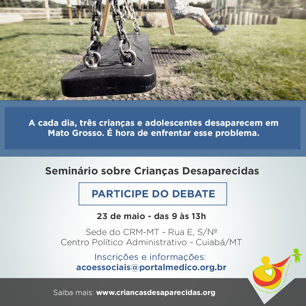 Com base nestes números, o Conselho Federal de Medicina (CFM) quer chamar a atenção da população para esse problema que é nacional. Com apoio do Conselho Regional de Medicina do Estado do Mato Grosso (CRM-MT), o CFM realiza, na quarta-feira, 23 de maio, o Seminário sobre Crianças Desaparecidas. O evento começará às 9h no Auditório do CRM localizado na Rua E, S/Nº Centro Político Administrativo, em Cuiabá. Na ocasião, os participantes serão convidados a debaterem por políticas públicas no setor e a aderirem ao abaixo-assinado em defesa da efetivação do Cadastro Nacional de Crianças e Adolescentes Desaparecidos.